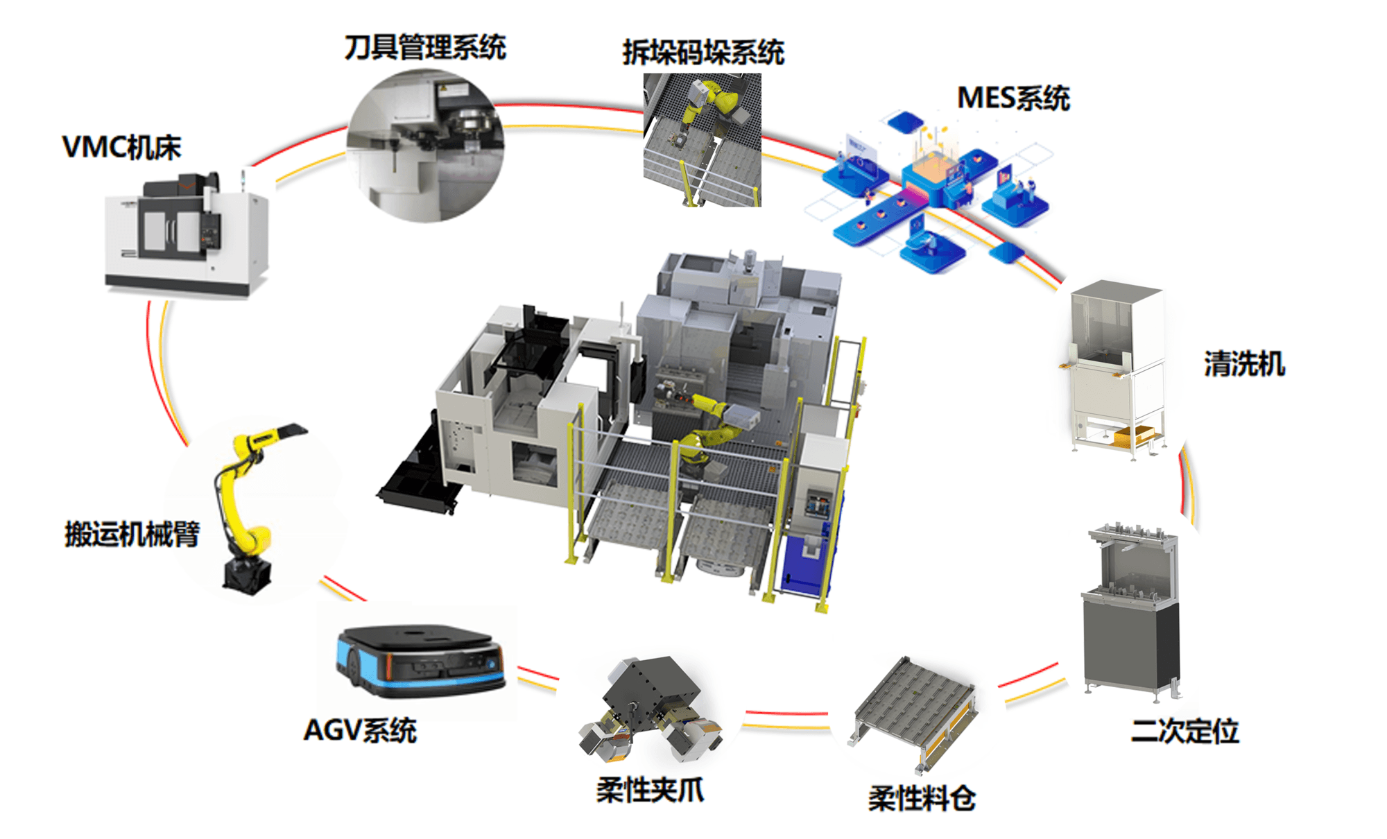 为应对更高的加工需求,海天精工推出一套完整的自动化解决方案,主体设备由2台VMC1000II立式加工中心、1台机器人、1套机器手、2套托盘、1套翻转工位组成。涵盖从加工到检测的全流程智能化生产体系,助力滑块企业实现高质量、高效率的现代化生产目标。